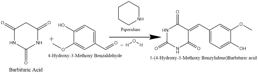 Barbituric acid synthesis using the Knoevenagel condensation system: In the presence of a catalyst such as piperidine, barbituric acid, which functions as a pyrimidine core, combines with vanillin (4-hydroxy-3-methoxybenzaldehyde to form a 5-(4-hydroxy-3-methoxylbenzylidene) barbituric acid derivative and water.