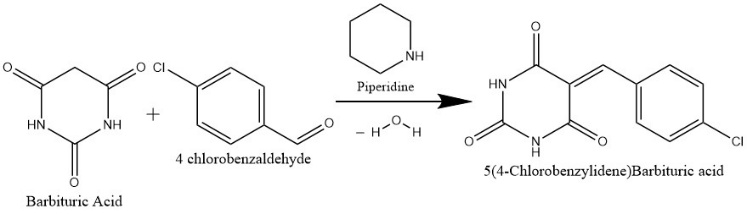 5-(4-Chloro-Benzylidene-Barbituric acid synthesis via the Knoevenagel condensation process: The 5-(4-Chloro-Benzylidene) Barbituric acid derivative and water are the products of this reaction between Barbituric acid (which functions as a pyrimidine core) and 4-Chlorobenzaldehyde (4-Chloro-Benzaldehyde) with the help of an initiating agent such as piperidine.