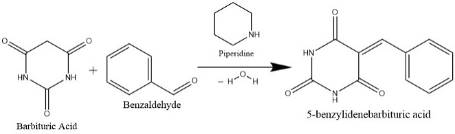 5-Benzylidene BA synthesis via the KR process: In this reaction, 5-Benzylidene Barbituric acid as well as water are produced when barbituric acid (which functions as a pyrimidine core) combines with benzaldehyde with the help of piperidine. Because barbituric acid contains an active methylene molecule due to the presence of a group of methylene (CH2) flanked by two electron-withdrawing groups, it is employed as a launching material[26].