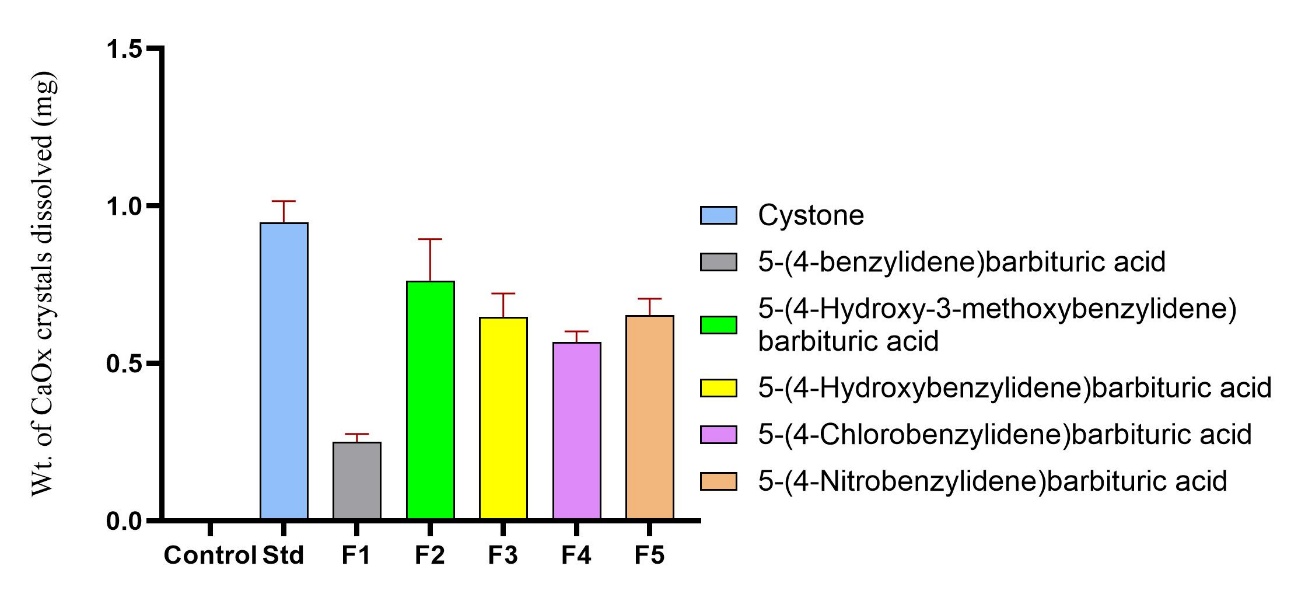 The capacity of synthetic barbituric acid derivatives for dissolving oxalate of calcium (CaOx) crystals was used to assess their in vitro antiurolithiatic action. In excess of 1.0 mg of CaOx was dissolved by the conventional medication Cystone, demonstrating the maximum dissolution activity and verifying its proven effectiveness. Due to the inclusion of both hydroxyl and methoxy groups, which probably improve the compound's contact with the crystal surface, 5-(4-hydroxy-3-methoxybenzylidene)barbituric acid (F2) exhibited the most substantial dissolution of all the produced compounds, at about 0.9 mg. Both F3 and F5, which have single polar substituents like -OH or -NO?, respectively, showed moderate activity. Conversely, the least active compounds were F1 (containing a not polar in nature benzylidene group) and F4 (chloro-substituted).