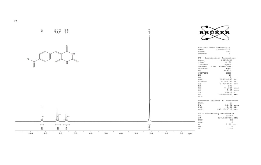 In essence, NMR spectroscopy was utilized to verify the compounds purity using 1H spectra acquired using a Bruker AMX 400 MHz spectrometer. The internal reference for the chemical shift of 1H was the DMSO peak at δ 2.50 ppm. The pyrimidine derivatives, 5-benzylidene BA, 5-(4-hydroxy-3-methoxybenzylidene) BA, 5-(4-hydroxybenzylidene) BA, 5-(4-chlorobenzylidene) BA and 5-(4-nitrobenzylidene) barbituric acid, were all structurally intact and showed no discernible deviation from the expected absorption bands that corresponded to their predicted functional groups, according to the NMR spectra. Additionally, NMR analysis verified the pyrimidine derivative samples’ high degree of purity.