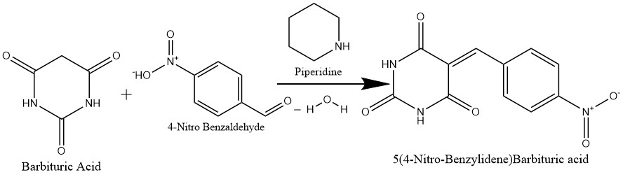 5-(4-Nitro Benzylidene) barbituric acid synthesis using the Knoevenagel condensation process: This reaction produces a 5-(4-Nitro-Benzylidene) Barbituric acid analog and water when Barbituric acid, which functions as a pyrimidine core, combines to Nitrobenzaldehyde (4-Nitro-Benzaldehyde) with the help of a catalyst such as piperidine.