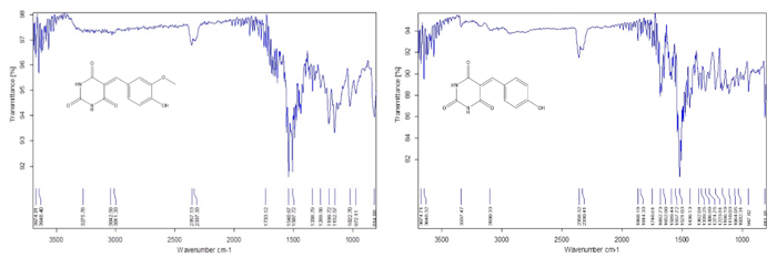 Figure 3: (a) FTIR of 5-(4-Hydroxy-3-Methoxy Benzylidene BA; (b) 5-(4-Hydroxy) Benzylidene BA