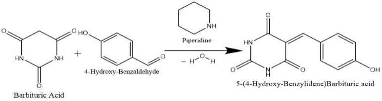 5-(-Hydroxy-Benzylidene) Barbituric acid synthesis via the Knoevenagel condensation process: In the presence of a catalyst such as piperidine, barbituric acid (which functions as a pyrimidine core) combines with 4-hydroxy-benzaldehyde (4-hydroxy-benzaldehyde) to form a 5-(4-hydroxy-benzylidene) barbituric acid analog and water.