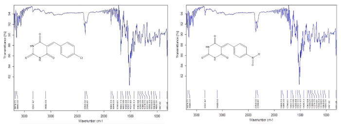 Figure 4: (a) FTIR of 5-(4-Chloro) Benzylidene barbituric acid; (b) 5-(4-Nitro) Benzylidene barbituric acid