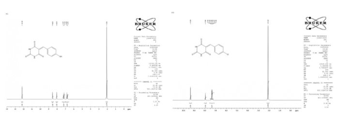 Figure 6: (a)1H NMR of 5-(4-Hydroxy) Benzylidene BA; (b) 1H NMR of 5-(4-Chloro) Benzylidene barbituric acid: