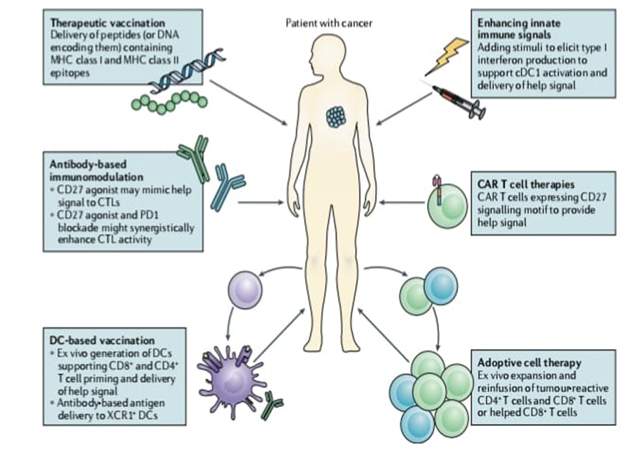 Enhancing CD4+ T cell assistance can improve cytotoxic T lymphocyte (CTL) responses for cancer immunotherapy. Strategies for improving cancer immunotherapy can involve enhancing CD4+ T cell activation or its effector functions. 29Therapeutic vaccines, whether peptide-, DNA-, or mRNA-based, should include both MHC class I and class II epitopes to stimulate CD4+ T cells. Alternatively, CD4+ T cell help can be mimicked by agonistic CD27 antibodies, potentially augmenting PD1 blockade in treating tumor-induced immune suppression. 30For DC-based vaccination, it is crucial to utilize DC subsets that prime CD4+ T cells and convey help signals to CTLs, or to direct antigens and activation signals to XCR1+ DCs via antibody conjugates. Adoptive cell therapy can be improved by including CD4+ T cells for tumor site assistance or by using pre-programmed CD8+ T cells that have received help signals during expansion. CAR T cell therapies could incorporate motifs that mimic help delivery through co-stimulatory receptor signaling. Treatments that induce a type I interferon response, such as STING agonists or radiation, may promote cDC1 activation and their engagement with CD4+ T cells. Cancer immunotherapy, a growing treatment modality alongside surgery, radiotherapy, and chemotherapy, aims to enhance tumor-specific T cell responses. Tumors are often poorly immunogenic, and the tumor microenvironment (TME) suppresses T cell activity. 31While CD8+ cytotoxic T lymphocytes (CTLs) are primary effectors, CD4+ T cells are also vital for effective anti-tumor immunity, aiding in T cell priming, effector function, and memory. Immunotherapies, such as immune checkpoint inhibitors targeting CTLA4 and PD1, promote anti-tumor CTL responses by overcoming negative regulation, though they can also trigger autoimmunity.32 CD4+ T cells play a critical role in optimizing anti-tumor immunity by assisting dendritic cells in antigen presentation and providing necessary co-stimulatory signals to CD8+ T cells, thereby promoting their expansion and differentiation into effective effector or memory cells.