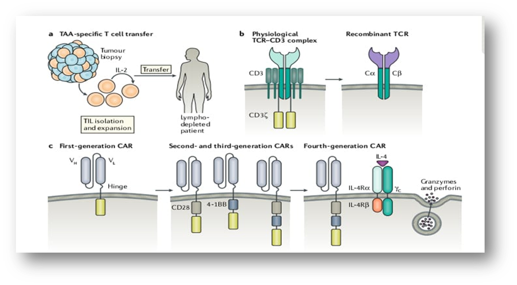22Adoptive cell transfer (ACT) is an immunotherapeutic strategy that involves the ex vivo expansion and infusion of autologous lymphocytes possessing antitumor activity into cancer patients. This method aims to amplify antigen-specific T-cell populations, thereby augmenting the antitumor immune response through cytokine release and tumor cell lysis. ACT necessitates the isolation or generation of autologous lymphocytes with antitumor capabilities. One approach involves isolating Tumor-infiltrating lymphocytes (TILs) from patient tumor samples, followed by ex vivo culture and expansion to therapeutic numbers, although the difficulty in achieving sufficient TIL expansion has limited its application beyond melanoma. A more direct method is the production of genetically engineered autologous T cells expressing tumor antigen-specific T-cell receptors (TCRs) or chimeric antigen receptors (CARs). TCR-engineered T cells are created by transferring antigen-specific TCR genes into lymphocytes isolated from peripheral blood, with these genetically modified cells, termed designer T cells (dTcs), then expanded in vitro. 23Successful examples include TCR-based dTcs targeting melanoma antigens (MART-1, gp100) that induced tumor regression in treatment-refractory melanoma, dTcs targeting NY-ESO-1 CTA showing objective responses in synovial cell carcinoma, and dTcs targeting GD2 leading to responses in neuroblastoma. CAR-modified T cells feature an extracellular targeting domain fused to an intracellular signaling domain, recognizing antigens independently of human leukocyte antigens (HLAs), thus offering broader clinical applicability compared to TCRs. Despite positive outcomes with TCR- and CAR-based therapies, optimization is needed to mitigate toxicity and overcome the immunosuppressive tumor microenvironment. Enhancing therapeutic efficacy can be achieved through IL-2 administration and host lymphodepletion (using combinations of cyclophosphamide, fludarabine, and total body irradiation) prior to ACT. Lymphodepletion is thought to work by eliminating immunosuppressive regulatory T cells (Treg) from the tumor microenvironment.24 Preliminary data indicate response rates of 50-70% in metastatic melanoma patients treated with TILs, IL-2, and intensive lymphodepletion. An ongoing trial is assessing HPV E6- and E7-reactive TILs (HPV-TILs) for metastatic HPV-positive cancers, with an interim analysis of cervical cancer patients showing complete responses in 2 of 9 treated individuals. Allogeneic stem cell transplantation (AlloSCT) can also be considered a form of unselected ACT, wherein donor-derived lymphocytes stimulate a graft-versus-tumor (GVT) effect, resulting in long-term cancer control.