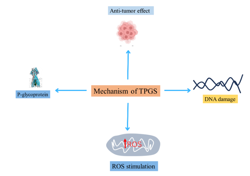 Figure 2. The effects of TPGS, including P-glycoprotein inhibition, ROS stimulation, DNA damage, and anti-tumor activity.