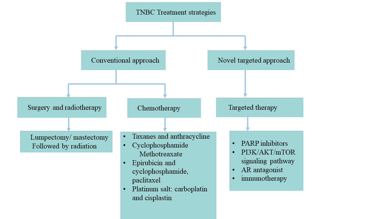 TNBC is a heterogeneous aggressive form of cancer for which no scientifically validated biologically targeted effective treatment is approved yet. Fewer ERs, PRs, and HER2 means a very hard job of finding a stable alternative treatment for TNBC. TNBC will be discussed, in the next sections, a few of the most efficacious and robustly employed treatment strategies for TNBC and why they failed [72].