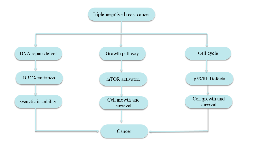 The toughest category of breast cancer known as TNBC. No HER2 receptor amplification, PRs or ERs. TNBC consists of both negative ER and PR in lateral myoepithelial cells of breast lobules as well as negative HER2 expression on the epithelial cells of breast. Missed, less than 1% ER or PR detect out of staining by immunohistochemistry + HER2 score of 0/+1 or +2 with FISH negative) [17-18]. ER, PR and HER2 negative cells are the most vulnerable type of this mutation in BRCA gene Another DNA damage checkpoint and component of DNA repair, BRCA1. It turns ER-negative cells to ER-positive and is required for mammary gland development of course ER-negative only. BRCA1 and BRCA2 fix the double-stranded break in DNA using homologous recombination. The homologous recombination is controlled by ATM, BRCA1 and BRCA2. DNA damage cause the ATM to be phosphorylated which then initiates the homologous recombination process in association with RAD51 and BRCA2 [19]. Genomic instability is the outcome of the inability for the BRCA gene mutation to be repaired by homologous recombination because it enables mutagenesis processes to fix DNA double strand breaks. The origin of Cancer arising from this genetic instability. Another factor that is part of the node of TNBC is alterations in the activity of mTOR pathway of mammal. This change leads the disease to become aggressive and invasive. Activation of the PI3K/AkT/mTOR (PAM) cascade in TNBC drove cancer cells to proliferate, grow and angiogenize. When mTOR is activated, two further mTOR complexes are created i.e mTORC1 and mTORC2. mTORC1 stimulates cell proliferation, whilst mTORC2 is needed to phosphorylate AKT [20-21]. The tumor cells have poor control over cell cycle progression, they either allow genesis of genetic diversity or license cells with DNA pathology to proceed to next cell in the cycle. TNBC cells are frequently characterized by genetic alterations of tumor suppressor protein (p53) and Rb pathway inactivation rather than c-Myc pathway mutations [ 15 ]. Phosphorylation by cyclin/Cdk complex activation of retinoblastoma initiates the Rb pathway at G1/S checkpoint of cell cycle control: which subsequently phosphorylates transcription factor E2F by Myc. Conversely, up regulation of CDNK2 by makes CDK2 less active inactivate the suppressor gene p53 that prevetn senescence in apoptosis pathways.Increased expression of CDNK2A and the related CDNK20 complex allows for the G1/S phase to be reached and the cell-cycle regulatory checks in the Rb pathways to be avoided. As a result, it causes cellular development and proliferation to be expressed more. TNBC is brought on by this recurring genetic change [22–23]. Figure 1 depicts the typical Triple negative breast cancer pathways.