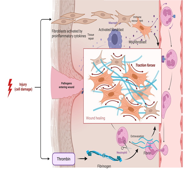 The succession of coordinated cellular events restores tissue integrity after injury and wound healing is a very complicated and highly controlled biological process. There are usually four overlapping stages of this process, namely hemostasis, inflammation, proliferation, and remodeling. The hemostasis phase occurs instantly after injury and starts with the platelet aggregation and the formation of a clot which aids in the prevention of bleeding as well as gives a temporary framework in which cell migration occurs. Growth factors platelet derived growth factor and transforming growth factor-b are also released by the platelets, thereby triggering the inflammatory response. Inflammatory responses Inflammatory cells such as neutrophils and macrophages move to the wound point during the inflammation stage to eliminate pathogens, damaged cells, and debris. These cells produce cytokines and chemokines that influence immune response and attract more cells that are necessary in the process of repairing tissues. During the proliferative stage, the fibroblasts, keratinocytes, and endothelial cells are also important in the reconstruction of tissue structure. Fibroblasts produce extracellular matrix like collagen whereas endothelial cell stimulates angiogenesis to resume blood flow. Keratinocytes move across the wound bed in a bid to restore the epithelial barrier by re-epithelializing it. Lastly, collagen fibers reorganize and become stronger, and unnecessary blood vessels in the organism are regressed to normalize tissue architecture during the remodeling or maturation stage. Myofibroblasts work towards contraction of the wound, which decreases the size of the wound. The combined action of inflammatory mediators, growth factors, and cell types is involved in conducting the process of effective tissue repair and rebuilding of skin functions Fig.3.