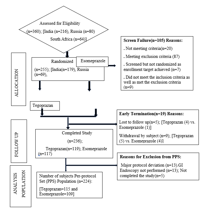 During the screening period, endoscopy was performed to evaluate the presence and severity of EE based on the Los Angeles Classification System. Following 4 or 8 weeks of treatment with either PPIs (esomeprazole, lansoprazole, dexlansoprazole, pantoprazole or rabeprazole) or tegoprazan, endoscopy confirmed that EE was healed. Patients with endoscopically confirmed healed EE were randomised to receive tegoprazan 25 mg or lansoprazole 15 mg at a 1:1 ratio using an interactive web response system of the central registration system. Patients received tegoprazan 25 mg or lansoprazole 15 mg once daily 30 minutes before breakfast.[32] The treatment was completed after 24 weeks