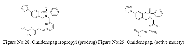 Omidenepag isopropyl is used in lowering elevated intraocular pressure to treat open-angle glaucoma.(40). Omidenepag isopropyl (OMDI) acts as a prodrug of omidenepag. It is converted into the active form, omidenepag, through esterase-mediated hydrolysis in the eye as it penetrates the cornea.(41)