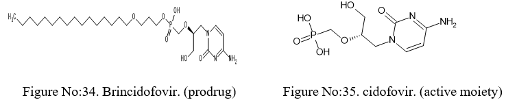 (BCV) is an antiviral drug. Its parent compound, cidofovir, was demonstrated in vitro efficacy against the variola virus. its clinical use was limited by a challenging side effect profile, particularly high levels of nephrotoxicity. In humans, Brincidofovir (CMX001) is processed by the liver into three main metabolites: CMX104, cidofovir, and CMX064.(48).The design of CMX001 allows it to remain unaltered in plasma and facilitates direct delivery of the drug to targeted cells. This design enhances cellular uptake and leads to increased intracellular levels of the active antiviral metabolite, cidofovir diphosphate.(49) In contrast to cidofovir, Brin cidofovir avoids interaction with organic anion transporter 1 in the renal tubules, thereby preventing nephrotoxicity.(50)