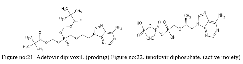 Adefovir dipivoxil, bis-(pivaloyloxymethyl) ester of adenofovir Converted by esterases and phosphodiesterases into tenofovir. Within T lymphocytes, tenofovir is transformed into its active form, tenofovir diphosphate, which acts as an inhibitor of the reverse transcriptase enzyme in the HIV virus (anti-HIV).(3)