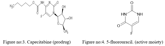 In tripartite prodrugs, the carrier is attached to the drug moiety via a linker. for example, Capecitabine is orally absorbed and enzymatically converted in three steps by carboxylesterase, cytidine deaminase, and thymidine phosphorylase into its active metabolite 5-fluorouracil (5-FU), which is employed in the management of breast cancer.(12).