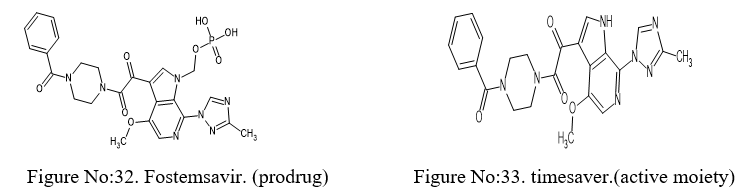 Fostemsavir is a phosphonooxymethyl prodrug of timesaver that employs a distinct mechanism of action by binding to the envelope glycoprotein 120 of HIV, preventing the virus from attaching to the CD4 receptors on host cells.(2). FTR shows a favorable pharmacokinetic profile, characterized by slow dissolution and enhanced absorption.(45). This prodrug was developed to improve the solubility of the compound within the gut. The alkaline phosphatase, found on the surface of the small intestine's brush border membranes, cleaves the prodrug.(46).Alkaline phosphatase converts the prodrug into its active form in the gastrointestinal tract just prior to absorption.(47)