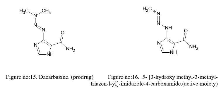 dacarbazine used as the first-line treatment for malignant melanoma.(27) Dacarbazine is a prodrug based on triazene that requires bioactivation before its activation. First, dacarbazine is N-demethylated by CYP to produce the reactive species 5-[3-hydroxy methyl-3-methyl-triazen-l-yl]-imidazole-4-carboxamide,. (MTIC) After formaldehyde is lost. MTIC rapidly degrades to generate the highly reactive intermediate methane diazohydroxide, which in turn releases molecular nitrogen and a methyl cation that methylates guanine at the O-6 position, causing significant cytotoxicity, along with the formation of the primary plasma and urinary metabolite aminoimidazole carboxamide (AIC).