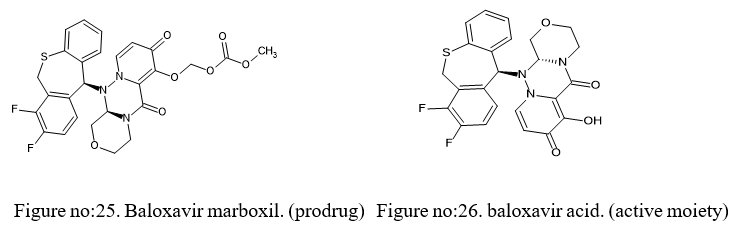 Baloxavir marboxil is a prodrug of the selective PA inhibitor(Polymerase Acidic protein.(37) It has demonstrated nanomolar antiviral effectiveness against both influenza A and B viruses in vitro, including strains that are resistant to existing antiviral treatments. The active form of this prodrug is baloxavir acid (BXA). Baloxavir marboxil is converted to its active form, baloxavir acid, which binds to CEN(Cap-dependent Endonuclease). In vitro preclinical shows that baloxavir acid halted viral RNA transcription and replication.(38). As an alternative strategy for influenza treatments, baloxavir acid and its prodrug, baloxavir marboxil, were developed, incorporating a phenolic hydroxyl group to improve the oral absorption of baloxavir acid.(39)