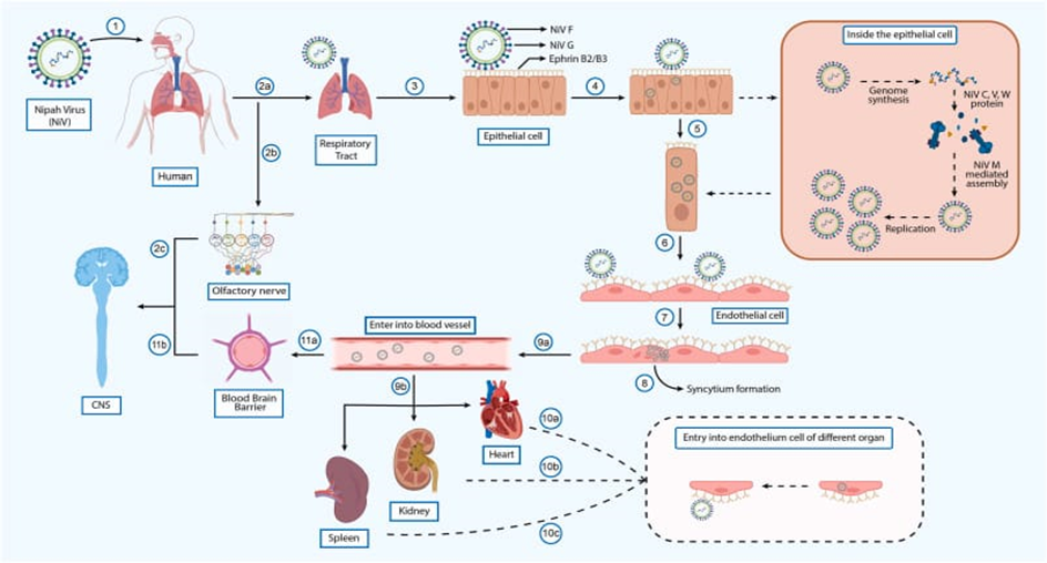 The major site of infection for the Nipah virus (NiV) in humans is the oronasal region, and the incubation period for this virus is 4 to 45 days. The neurological system, cardiovascular system, kidneys, spleen, and lungs are all susceptible to infection with the NiV virus (4). Symptoms of a NiV infection include a high temperature, headache, confusion, and vomiting, which are similar to those of the flu (1). Serious respiratory problems are common among people infected with NiV, in addition to neurological problems. Depending on the severity of the infection, a NiV-M infection can progress to a later stage and cause CNS encephalopathy. Diminutive mental status, changes in cerebellar function, and convulsions are also possible neurological signs (15). Encephalitis, in its most severe forms, can cause lethargy, disorientation, and, within 48 hours, seizures and coma. A few days is all it takes for death to happen (14).