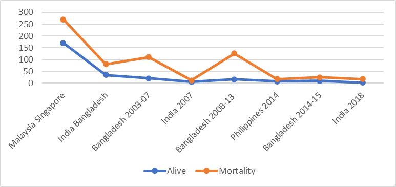 After further investigation, it was found that the first Nipah virus outbreak in Malaysia and Singapore (1998–1999) was indeed Nipah virus, rather than Japanese encephalitis (JE) (1-2). Fever, headache, and diminished awareness were reported in many cases in the Malaysian state of Perak in September 1998 (1). A patient from the town of Sungai Nipah tested positive for a new virus (NiV) in their cerebrospinal fluid (CSF) in March 1999 . Males who worked with pigs made up the bulk of the patients, and there weren't many young children. in (4). In 2001, a second, geographically unconnected outbreak of the disease occurred in the Meherpur district of Bangladesh and Siliguri, West Bengal, India (2). The Nipah virus is thought to be stored by Pteropus bats. Close contact with pigs was identified as a substantial risk factor for outbreaks (1), even though the majority of patients in Bangladesh reported contact with pigs. A total of 209 cases of NiV were reported between 2001 and 2012, with 161 (or 77% of the total) resulting in fatalities (4). The worst case of person-to-person transmission occurred in Faridpur in 2004. Patient saliva has tested positive for NiV RNA, suggesting that droplet infection is a factor in the transmission of this virus (1). Nipah virus emerged in the districts of Kozhikode and Malappuram in May 2018 in the southwest coast Indian state of Kerala, which is geographically far from where the virus had previously broken out. Date palm sap isn't often drunk in this area, unlike in other parts of the world. Over 90% of those infected died during this epidemic, and at least 17 people were killed (4). There have been only three outbreaks of NiV in India, thus there isn't enough data to draw any firm conclusions, even if the epidemiological pattern is similar to Bangladesh (2).
