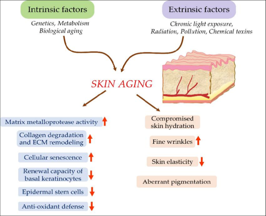 As we grow older, our skin naturally starts to show signs like fine lines and wrinkles. This type of aging, known as intrinsic aging, happens due to various internal biological processes such as: genes, hormonal changes, slower cell renewal, oxidative stress, and reduced repair capacity of the body.