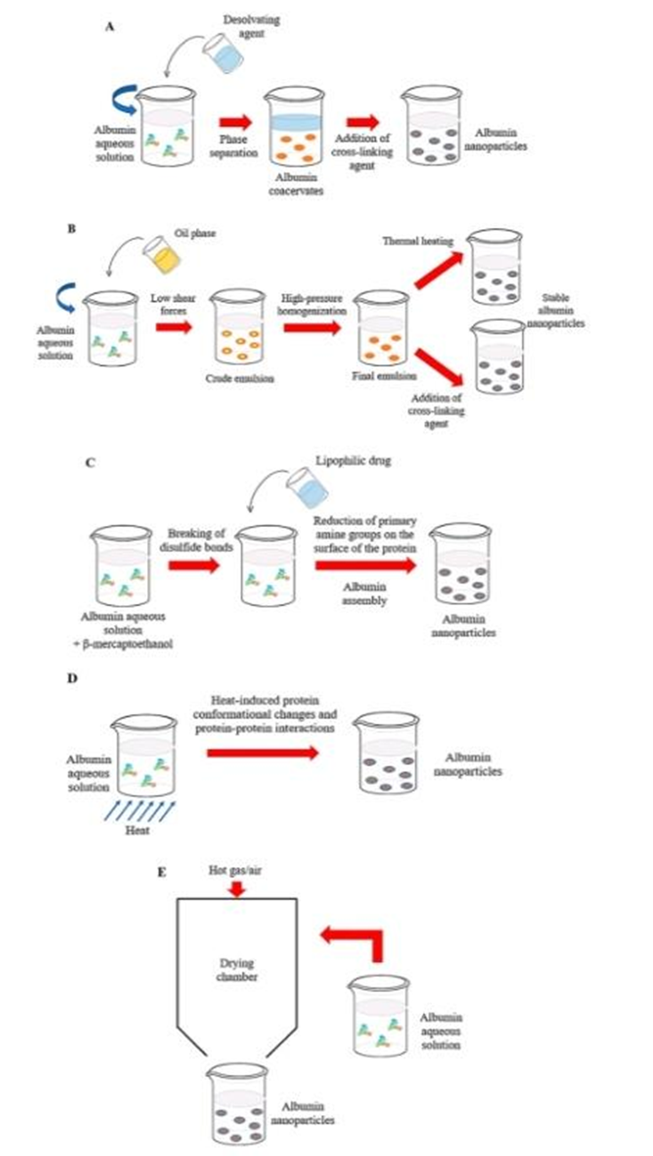 Creating albumin-based nanoparticles can be done through different manufacturing approaches. These methods fall into two main groups: chemical methods, which use substances like ethanol, cottonseed oil, or beta-mercaptoethanol to help form the nanoparticles, and physical methods, which rely on factors such as heat or pressure to create the nanoparticles.(22)