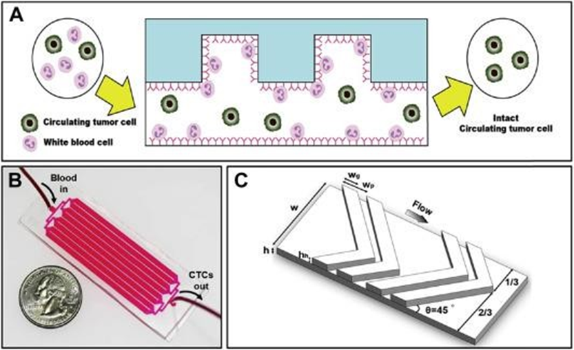 Fig 3. (A) Pictorial presentation of negative enrichment (side view). When the blood sample enters the inlet, the nontarget cells (i.e., leukocytes) are specifically captured on the CD45 antibody-coated channels, whereas the target cells (i.e., CTCs) are eluted through the outlet. The ridges on the top of the main straight channel create a helical flow that creates considerable interaction between the cells and the antibody-coated channel surface. (B) A photograph of the fabricated GASI chip. The GASI chip consists of an inlet, eight channels, and an outlet. Each channel is 2.1 mm in width and 50 mm in length. To prevent breakdown of the PDMS channel due to their flexibility, a wall 400 mm in width bears the pressure. (C) herringbone structure and key parameters used in this study