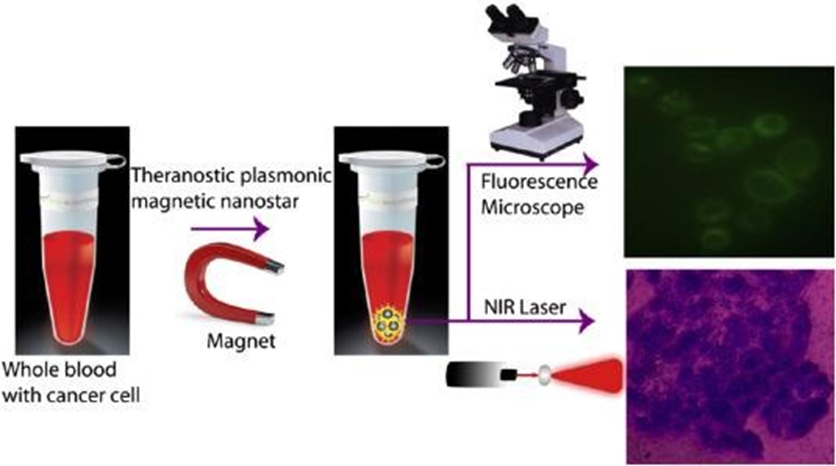 Cancer is a major health issue, with about 1.66 million new cases expected to be diagnosed in 2013 alone, according to the American Cancer Society. Sadly, cancer is also projected to cause nearly 580,350 deaths that year, making it responsible for almost 1 in every 4 deaths. Early detection and effective treatment are crucial for saving lives, and a major contributor to cancer-related deaths is the spread of cancer cells, known as metastasis. This happens when cancer cells, called circulating tumor cells (CTCs), enter the bloodstream. Because of this, scientists and doctors are focused on developing new ways to detect CTCs at earlier stages, which can help doctors treat patients more effectively and predict the progression of cancer. Although CTCs have been known since 1869, they are generally only detectable in patients with advanced cancer. Detecting them early is particularly difficult because they appear in extremely low numbers—just a few CTCs per million healthy blood cells. To address this challenge, improving methods to separate and enrich these cells is essential. One promising approach involves using nanomaterials as agents for both detecting and treating cancer. While this technology is still in its early stages, it holds a lot of potential for improving cancer detection and treatment in the future. Nanoparticles, with their unique properties, could play a key role in this new era of cancer care. Nanomaterials have unique photothermal properties, making them useful for both detecting cancer and treating it noninvasively through photothermal therapy. Over the past five years, researchers have shown that it's possible to combine diagnosis and treatment into a single, multifunctional nanomaterial known as "theranostic nanoparticles." The ideal theranostic material should have a few key qualities: (1) the ability to selectively accumulate in diseased tissue, (2) the ability to deliver targeted therapeutic actions, and (3) safety, meaning it can be broken down by the body into harmless substances. We believe that creating effective theranostic materials is crucial for the early detection and treatment of cancer in the modern era. In this review, we’ll discuss recent breakthroughs in the development of "theranostic nanomedicine" based on our own research. We’ll also explore where the future of this exciting field could take us in terms of research and real-world applications for treating cancer.