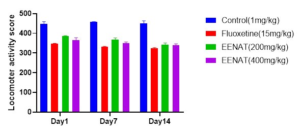 One way ANOVA exhibited that EENAT significantly influenced marble burying behavior. The Dunnets test showed that the EENAT, 200 and 400 mg/kg significantly reduced the number of marbles buried (Table no.2 and fig no. 1) Motor activity was not affected by EENAT at the dose of 200 and 400 mg/kg, however EENAT at a dose of 400mg/kg significantly suppressed the locomotor activity (Table no.3 and fig no. 2).