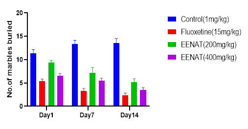 Mice were divided into different groups (n=6). EENAT (200, 400 mg/kg) p.o. fluoxetine(15 mg/kg). EENAT and fluoxetine were administered orally (p.o.) 30 min prior to the assessment of marble-burying behavior and locomotor activity. The control group received 0.9% saline (10 mL/kg, po). After 30 min, the marble-burying behavior and motor activity were assessed in separate groups.