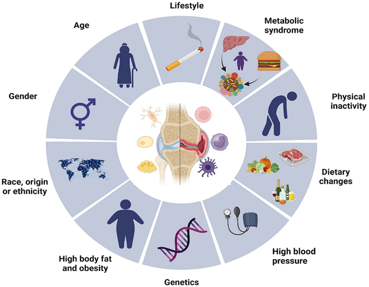 The chances of developing osteoarthritis increase due to several factors. These include family history (genetics), lifestyle habits, natural changes in the body like age and gender, and health problems such as obesity and high blood pressure50.