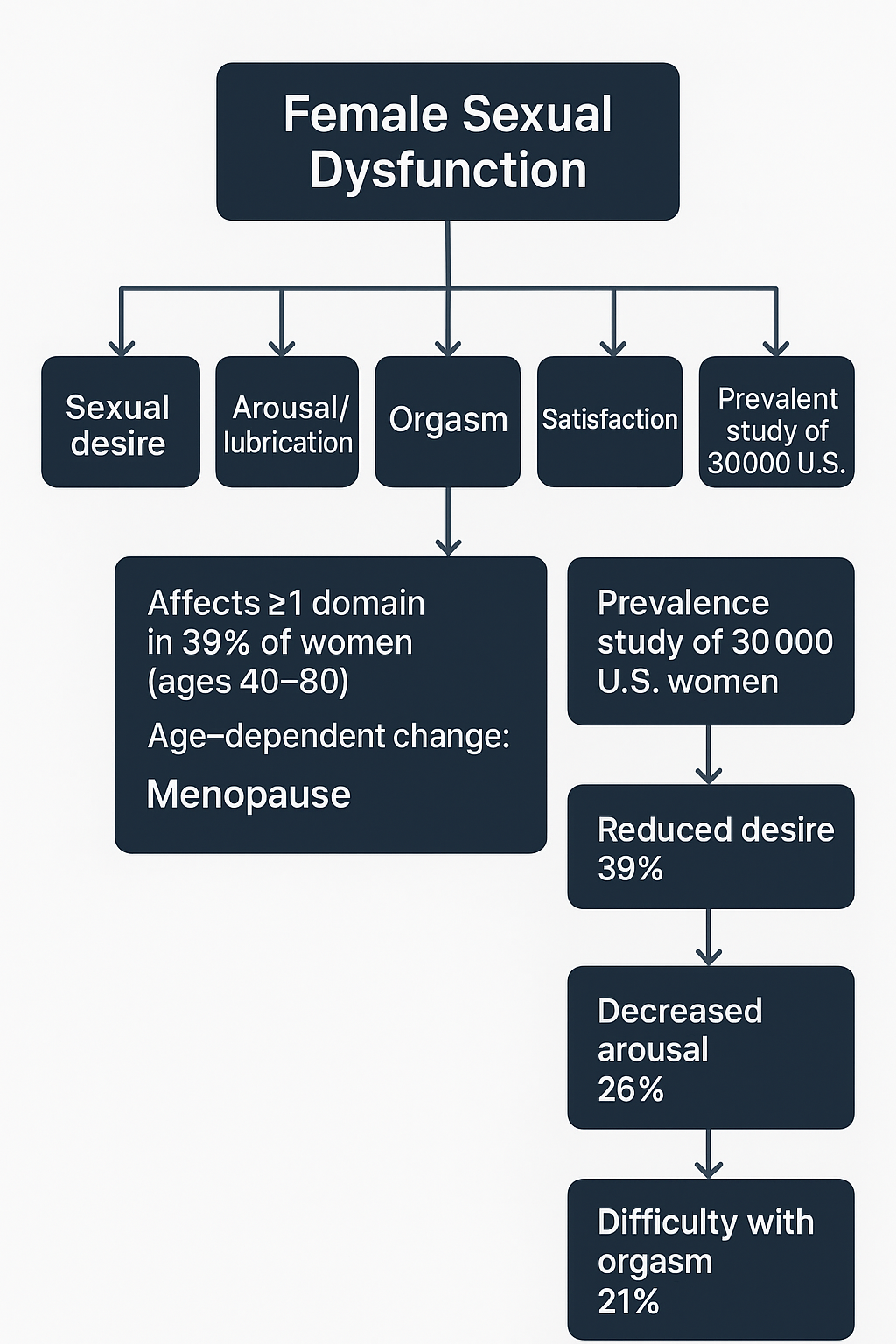 The Figure 4 shows how sexual desire, arousal/lubrication, orgasm, overall satisfaction, and pain experienced during sexual intercourse are the criteria used to classify female sexual dysfunction [35,38].