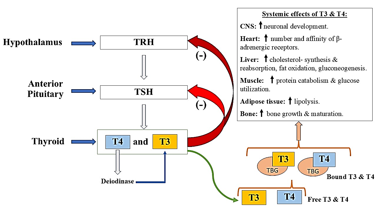 Figure 1: Illustration outlining the functional hypothalamic-pituitary-thyroid (HPT) axis, including the physiological effects of circulating and protein-bound forms of tri-iodothyronine (T3) and thyroxine (T4) throughout the body. Abbreviations: TBG– thyroxine-binding globulin; TRH– thyrotropin-releasing hormone; TSH– thyroid-stimulating hormone.