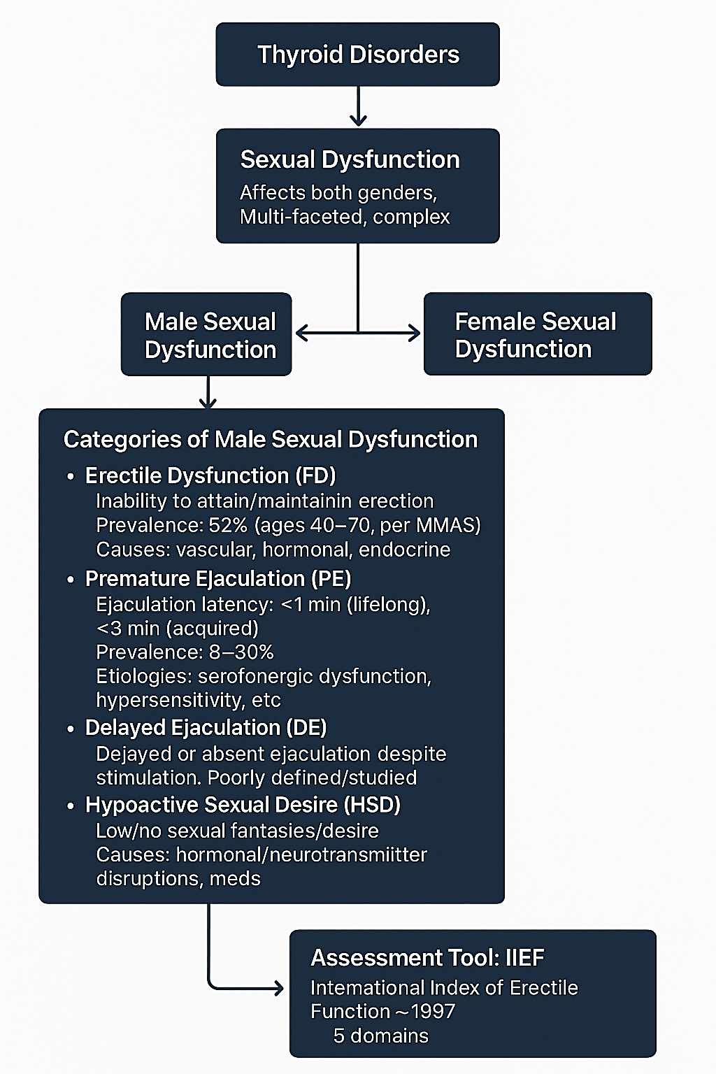 Significant disturbances in the sexual health of both men and women have been linked to thyroid disease. A complex and common disorder that affects both sexes, sexual dysfunction can have several underlying causes. It typically comprises of several connected symptoms, sometimes including several different illnesses. It may be difficult to tell certain symptoms or diseases apart because they might manifest in similar ways [32]. The International Index of Erectile Function (IIEF), which was first introduced in 1997, weighs five main factors to measure male sexual health: erectile function, orgasm, sexual desire, contentment with intercourse, and overall sexual satisfaction. Despite limitations, this technique is highly validated across cultures and is regarded the baseline for measuring male sexual function (Figure 3) [33–37].