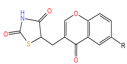 Nazreen et al. (2021) had generated a library of chromone-2,4- thiazolidinedione conjugates by way of the use of hydrogen gas and lead/ carbon as catalysts through knoevenagel condensation. In terms of lowering blood glucose level, compounds S-39 and S-40 have been as effective. In the molecular docking evaluation, all the compounds had an excessive go with the flow rating when as compared to the Peroxisome Proliferated-Activated Gamma receptor target, and S-39, S-40, and Pioglitazone all exhibited nearly identical docking results, sharing one hydrogen bond (with HIS449) and one cation bond (with ARG288). Each of the three compounds has one hydrogen bond and one cation bond. Compound S-40 significantly increased the expression of the PPAR-γ gene by 2.56 times when compared to the gold standard medication pioglitazone. Compounds S-39 and S-forty are non-toxic, which suggests that they could be helpful in the hunt for a new antidiabetic medication [34].