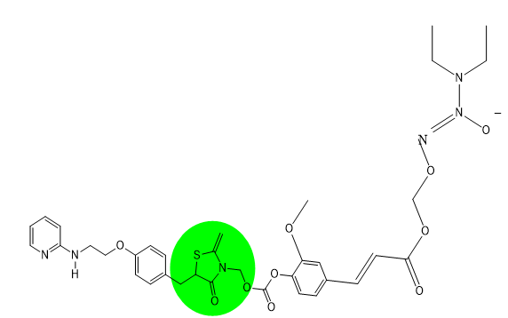 Liu et al. (2019) synthesized trihybrids combining rosiglitazone, ferulic acid, and a nitric oxide (NO) donor to enhance glucose tolerance and address cardiovascular risks associated with rosiglitazone. The hybrid compound 21 showed superior glucose-lowering effects in diabetic models, attributed to its NO production, antioxidant properties, and reduced fluid retention compared to rosiglitazone alone. Moreover, compound 21 displayed stability in simulated gastrointestinal environments and selectively released rosiglitazone in plasma, which improved its safety profile, marking it as a promising candidate for diabetes management? [30].