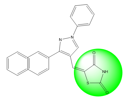 Bansal et al. (2019) Synthesized 14 New derivatives of Thiazolidine-2,4-dione, which have been blended with a Pyrazole nucleus in a 4-step synthetic manner. There is too much concordance between the spectral information and related structures. The synthesized compounds underwent docking studies upon Peroxisome Proliferated-Activated Gamma receptor and showed interplay through water molecule combined with Glycine A284 and their in vivo and in-vitro antidiabetic properties also checked towards Peroxisome Proliferated-Activated Gamma and Alpha-amylase Compound. S2 validated incredible efficacy in reducing blood glucose levels and revealed an inhibitory effect on the alpha-amylase hobby with IC50 four.08 μg/mL[35].