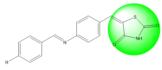 Chhajed et al. (2017) synthesized and evaluated a series of substituted benzylideneamino-benzylidene-thiazolidine-2,4-diones as potential PPAR-γ agonists for type 2 diabetes management. Compounds TZD-1, TZD-4, TZD-16, and TZD-34 demonstrated significant glucose uptake in 3T3-L1 cell assays, showing 1.6-2.1-fold increases over control, comparable to rosiglitazone. Docking studies confirmed strong interactions with PPAR-γ, with para-substituted analogs displaying the highest binding affinity. These findings highlight the potential of structural modifications to thiazolidinedione for enhanced antidiabetic efficacy and reduced adverse effects [33].