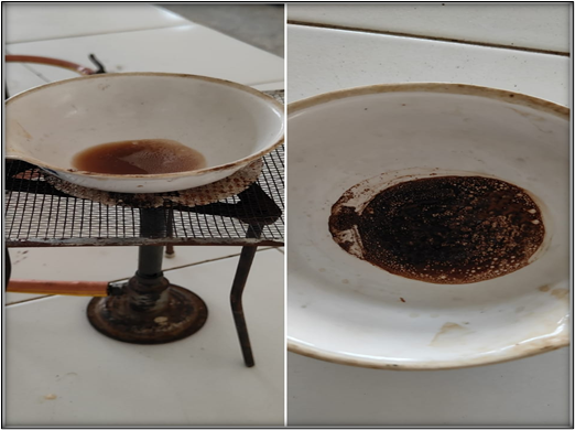 5. Percentage of solid contents: Four grammes of formulated shampoo were put onto a dry, clean evaporating dish. The total weight of the evaporating dish containing the shampoo was recorded as W?, and it was then placed on a hot air oven set at 50 °C until the liquid content had completely evaporated. Finally, the cooled evaporating dish containing the solid content was weighed and recorded as W2. The percentage (%) of the solid content was computed as [(W?-W?) ÷ W?] x100 [16].