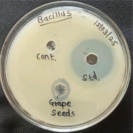 The strong polyphenolic content and related health advantages of grape seed extract (GSE), which is derived from Vitis vinifera are well- known1. GSE's antibacterial efficacy against Gram-positive (Bacillus subtilis) and Gram-negative (Escherichia coli) bacteria is assessed in this study utilizing the agar well diffusion method2. The extract showed 12 mm inhibition zones against both strains, indicating modest antibacterial activity3. In contrast to the typical antibiotic Metronidazole (25–26 mm zones), GSE exhibited less pronounced but nonetheless noteworthy inhibitory effects4. These results provide credence to GSE's possible application as a natural antibacterial.