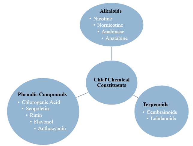 Fig.5. An outline of the different types of tobacco-produced specialized metabolites (SM). The plant contains a variety of bioactive substances, notably phenolic compounds—such as chlorogenic acid, scopoletin, rutin, flavonols, and cembranoids—as well as alkaloids including nicotine, nornicotine, anabasine, and anatabine.[14]