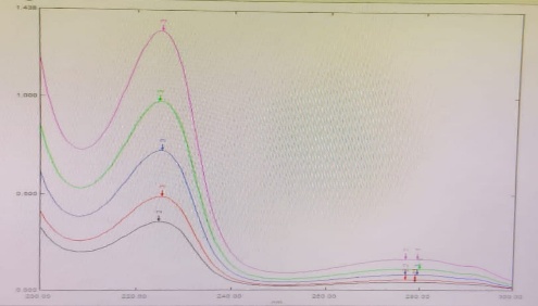 Standard drug solution of rizatriptan benzoate was prepared by dissolving 10mg rizatriptan benzoate in distilled water and made to 10ml with distilled water to obtain stock solution of 1 mg/ml or 1000µg/ml concentration. From the stock solutions, 1.0ml of Rizatriptan Benzoate was transferred to 100ml volumetric flask and the volume was adjusted to the mark with distilled water to obtain strength of 10µg/ml. The solution was scanned in the UV range 200-400 nm.First, second, third, fourth order derivative UV spectra for the solutions of Rizatriptan Benzoate were recorded in a 10mm cell over the range 200-400nm using distilled water in the reference cell. Each spectrum was recorded in triplicate. The zero-crossing point (ZCP) for Rizatriptan Benzoate were recorded. Characteristic wavelengths (ZCPs) for Rizatriptan Benzoate were confirmed by varying the concentration of the drug. For each replicate measurement, the cell was refilled with fresh solution.Average of 5 sets of values were taken and summarised in (Table 1 and Figure 19) and the standard curve was plotted [12].