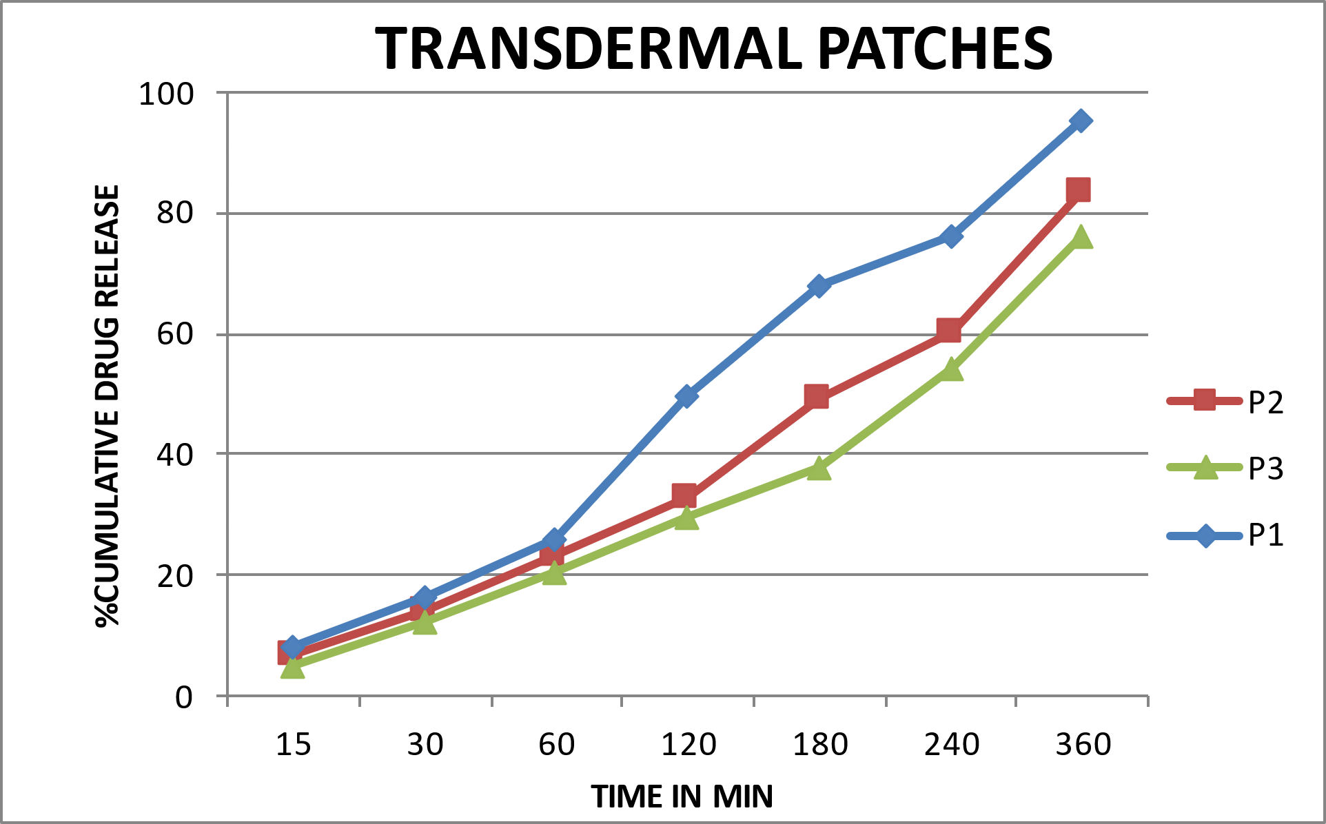 The in-vitro drug release from the rizatriptan transdermal patches showed that P1 released the highest amount of drug (95.45 ± 0.22% at 360 min), followed by P2 (83.43 ± 0.26%) and P3 (76.23 ± 0.32%)as shown in Table 5 and Figure 6 . P1 exhibited the fastest and most complete release because it has the lowest polymer concentration and thinnest film thickness, which reduces the diffusion barrier and allows the drug to permeate more easily through the membrane. In contrast, P2 and P3 have thicker and denser polymer matrices, which slow drug diffusion and result in more sustained release. Therefore, P1 is considered the best formulation for achieving rapid and effective drug delivery.