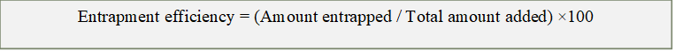 3. Entrapment efficiency. The proportion of medication entrapment is used to compute entrapment efficiency. A mini-column centrifugation technique was used to separate the unentrapped medication in order to ascertain the entrapment efficiency. 0.1 percent Triton X-100 or 50 percent n-propanol were used to rupture the vesicles during centrifugation.