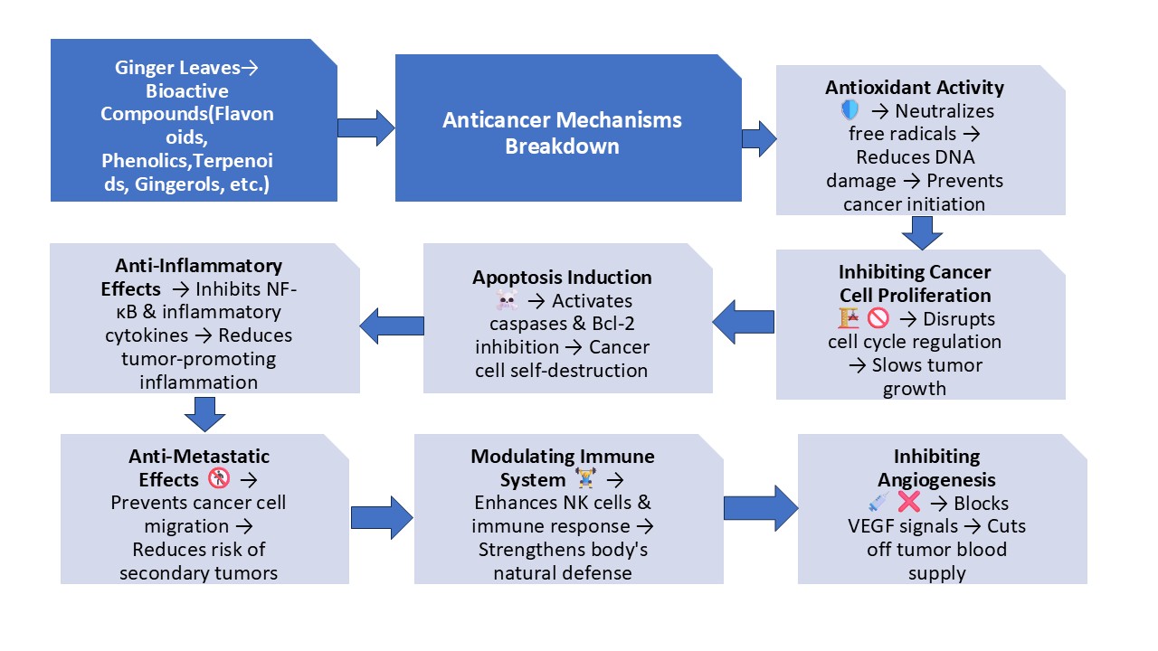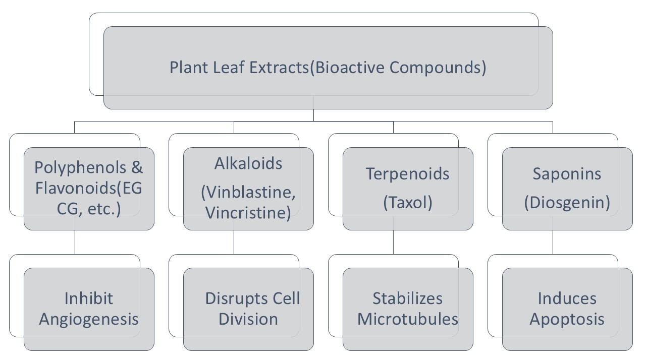 Plant leaf extracts contain bioactive compounds that have shown potential as anticancer agents. These compounds interact with human cells through various mechanisms, including apoptosis (programmed cell death), inhibition of cancer cell proliferation, and suppression of metastasis. Some of the key bioactive compounds in plant leaves that contribute to anticancer effects include: