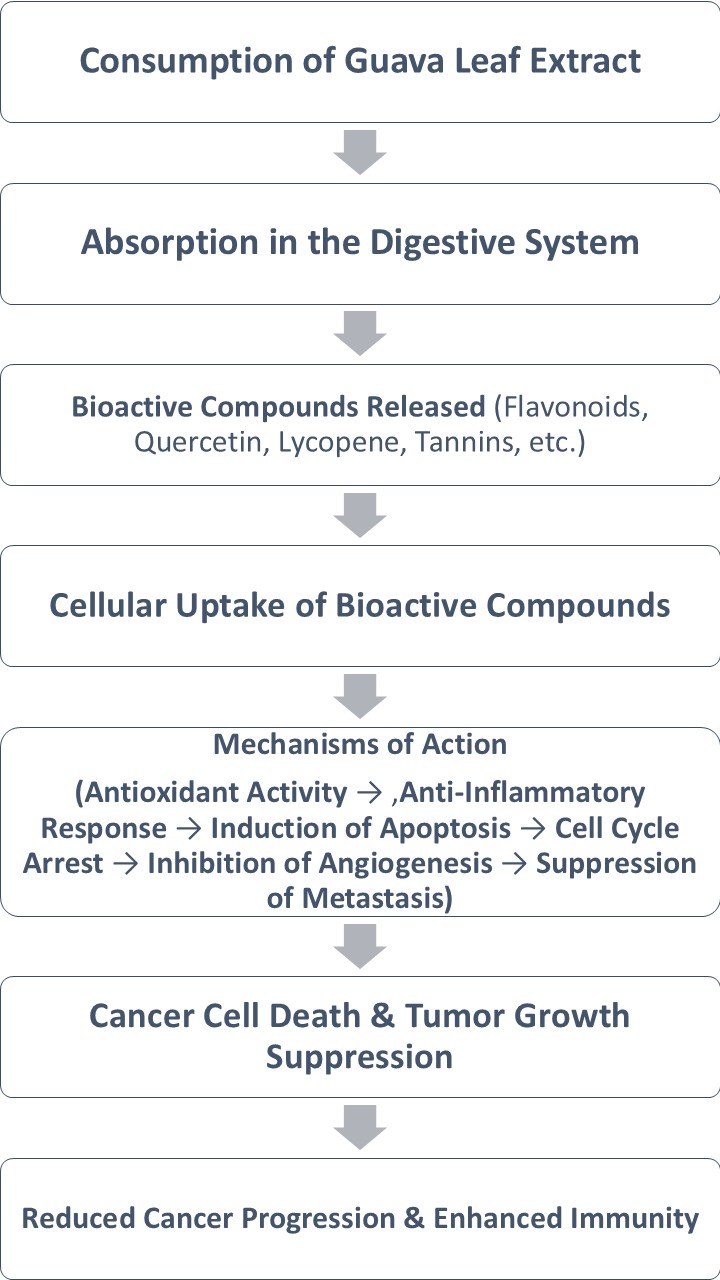 The Myrtaceae class contains the guava tree (Psidium guajava L.), a particular and traditional plant acknowledged for its numerous dietary and medicinal uses. In tropical regions which include Bangladesh, Pakistan, Indonesia, India, and South America, this fruit is commonly cultivated and eaten. Different nations use different portions of the guava tree, including its roots and leaves. The leaves of the guava tree (Psidii guajavae GL) are dark green, elliptical, and oval-shaped, featuring a blunt tip. Guava leaves, along with the fruit's pulp and seeds, are employed in the treatment of specific respiratory and gastrointestinal issues, as well as to boost platelet counts in individuals with dengue fever. Additionally, Guava leaves are commonly recognized for their antispasmodic, cough-relieving, anti-inflammatory, antidiarrheal, antihypertensive, anti-obesity, and anti-diabetic effects. Research involving animal models has also demonstrated that Guava leaves extracts can serve as effective antitumor, anticancer, and cytotoxic agents.