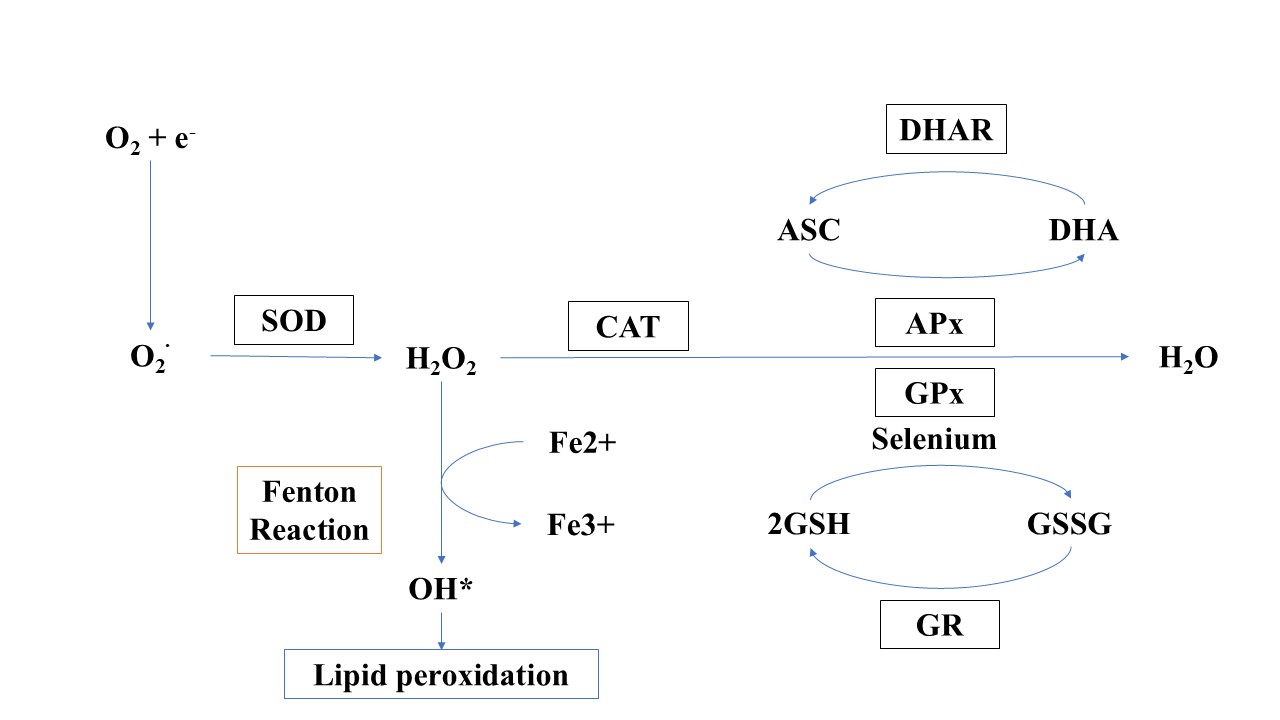 (SOD): Superoxide Dismutase, (CAT): Catalase, (ASC): Apoptosis-associated speck-like protein , (DHA): Docosahexaenoic acid , (DHAR): Dehydroascorbate reductase , (APx): Ascorbate peroxidase , (GPx): Glutathione peroxidase , (GR): Glutathione reductase , (GSSG): Glutathione disulfide. Enzymes called antioxidants prohibit oxidation, a type of chemical reaction that may end in the formation of free radicals damaging cells. They play a role in guarding the body towards oxidative stress, which is linked to aging and a variety of disorders. Antioxidants are typically classified into two main categories: enzymatic and non-enzymatic.