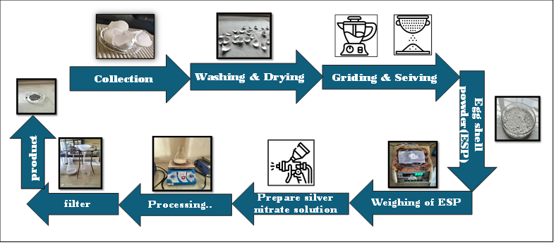 The collected chicken egg shells were thoroughly cleaned with distilled water and dried in the open surroundings. Dry egg shells were ground into a fine powder in a kitchen blender. The egg force gained was a proset and powder with a size <25 µm was stored in the exuscators until it was used